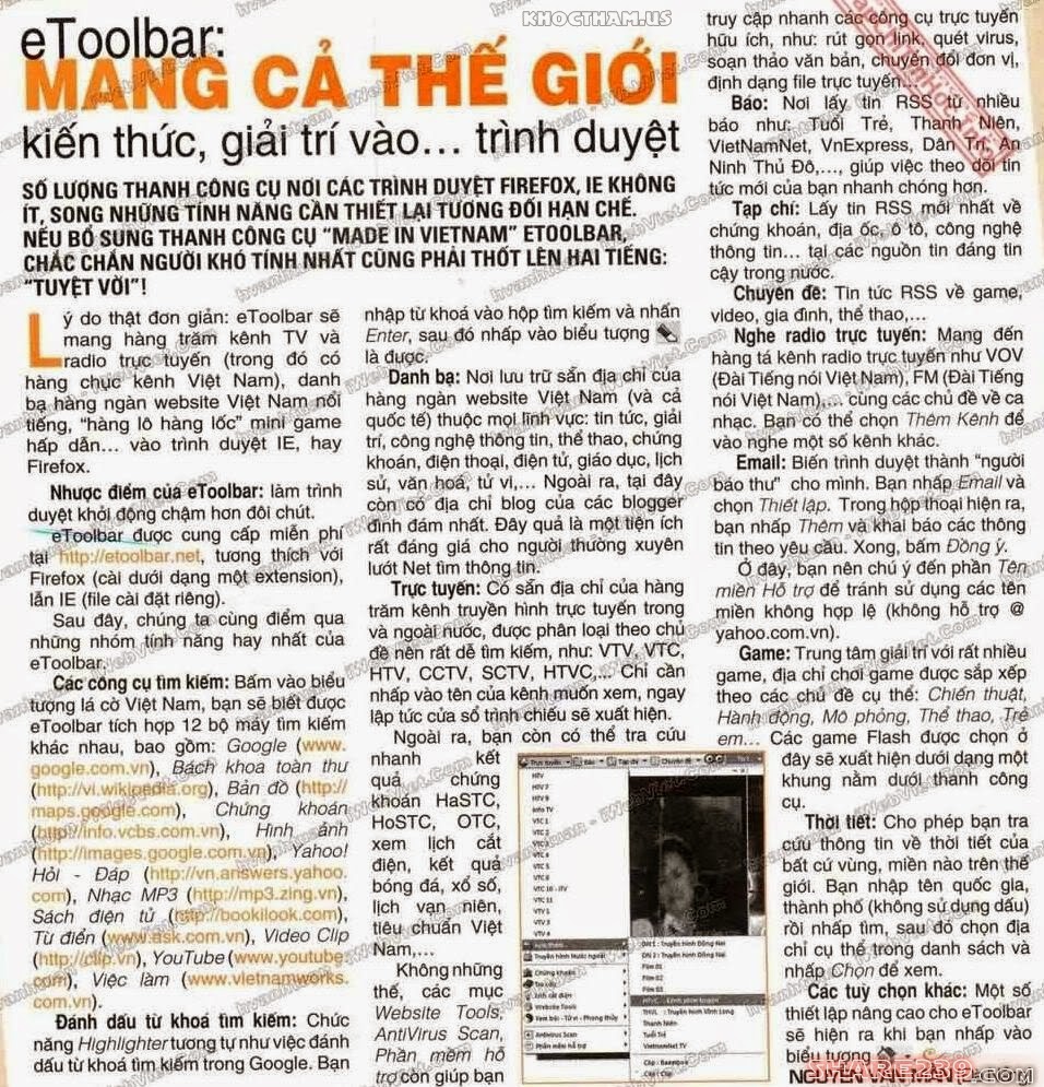 eToolbar mang đến cho bạn: Hệ thống Tìm kiếm đa năng - Danh bạ Website - Blog - Đọc tin RSS - Nghe Radio - Xem Ti Vi - Dự báo thời tiết - Quản lý tài khoản Email - Chơi Game Flash - Ngăn chặn PopUp hiệu quả - Cập nhật liên tục ........ eToolbar: Công cụ trực tuyến miễn phí không thể thiếu với người dùng Internet. !