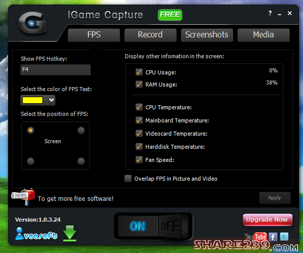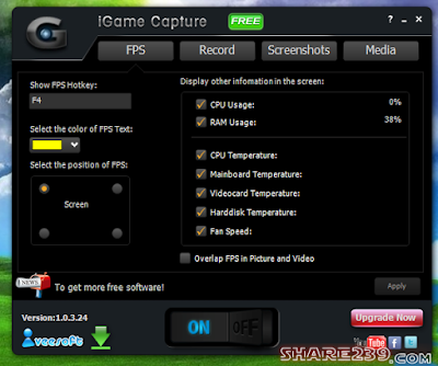 - Ngoài ra Igame Capture có thể hiển thị nhiều thông tin hệ thống, chẳng hạn như sử dụng CPU, sử dụng bộ nhớ, nhiệt độ CPU và tốc độ quạt, vv
